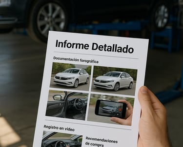 Entrega de un informe completo con fotos y videos, detallando el estado del vehículo y recomendaciones.